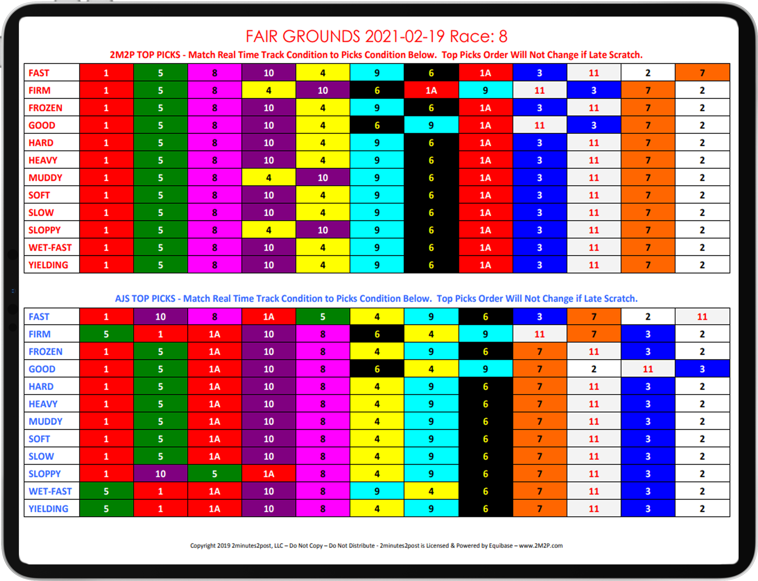 EVERY RACE FEATURES OUR DUAL PROPRIETARY ALGORITHMS’ TOP PICKS. THE TOP PICKS READ FROM LEFT TO RIGHT AND ARE ADJUSTED PER TRACK CONDITION. SCRATCHES DO NOT EFFECT THE PICKS ORDER.